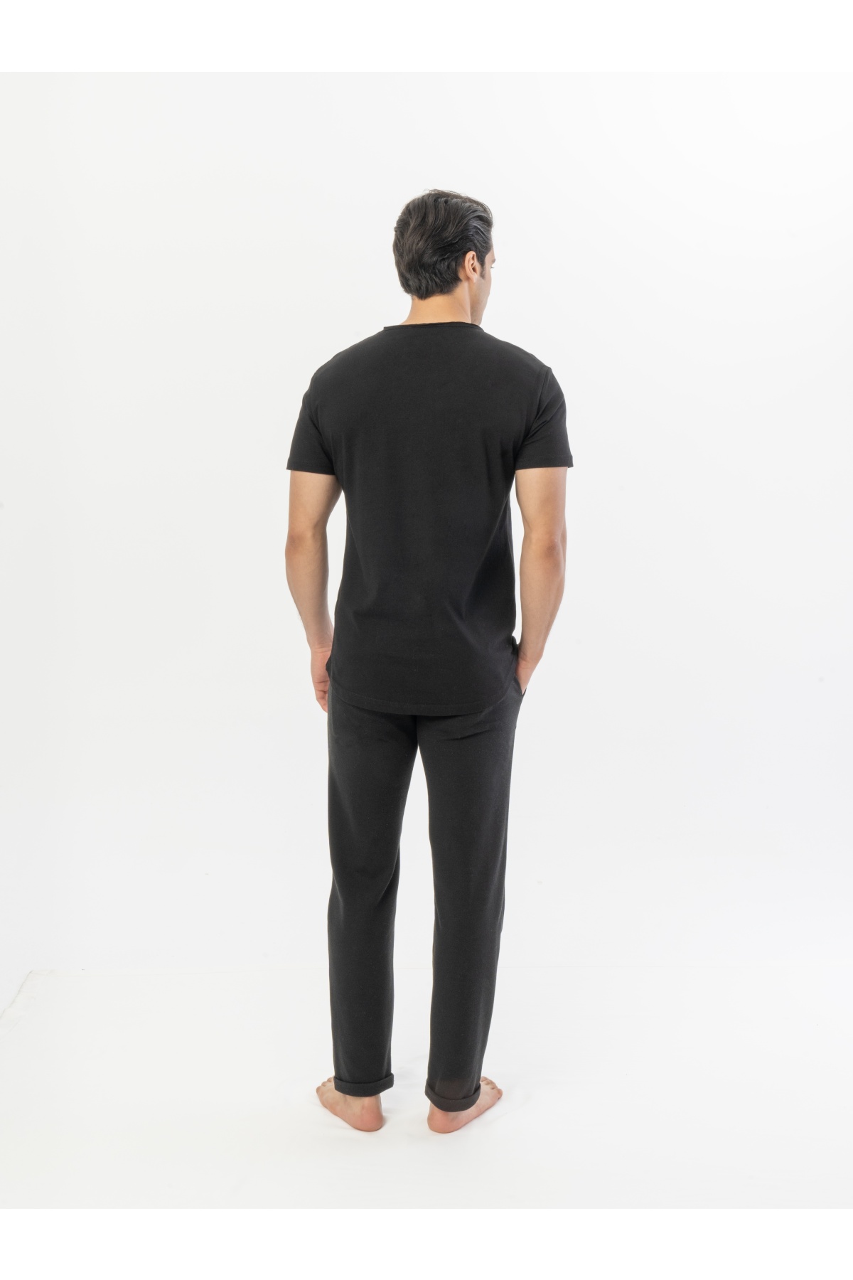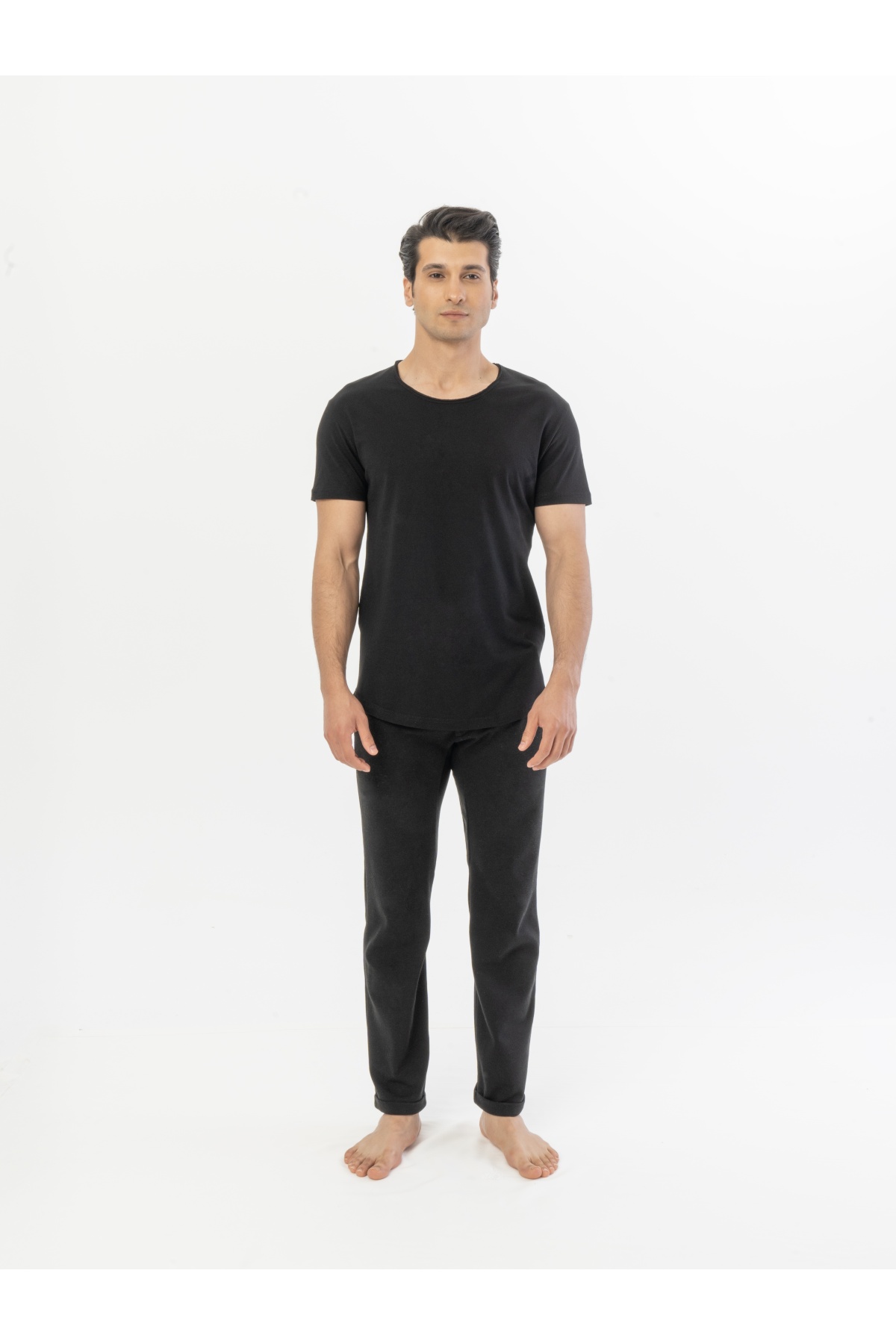 The long, round detail at the hem of the t-shirt makes the back appear more upright and longer.
